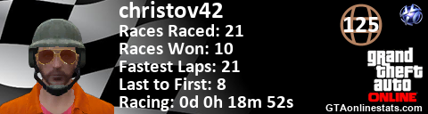 [URL=http://GTAonlinestats.com/showplayer/christov42][IMG]http://GTAonlinestats.com/racesignature/christov42/sig.png[/IMG][/URL]