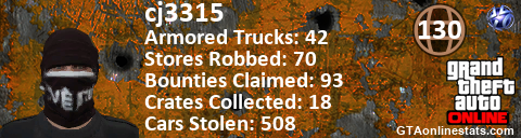 [URL=http://GTAonlinestats.com/showplayer/cj3315][IMG]http://GTAonlinestats.com/crimesignature/cj3315/sig.png[/IMG][/URL]