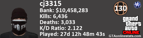 [URL=http://GTAonlinestats.com/showplayer/cj3315][IMG]http://GTAonlinestats.com/signature/cj3315/sig.png[/IMG][/URL]