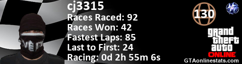 <a href="http://GTAonlinestats.com/showplayer/cj3315"><img src="http://GTAonlinestats.com/racesignature/cj3315/sig.png" alt="cj3315" border="0" /></a>