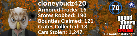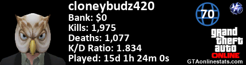 <a href="http://GTAonlinestats.com/showplayer/cloneybudz420"><img src="http://GTAonlinestats.com/signature/cloneybudz420/sig.png" alt="cloneybudz420" border="0" /></a>