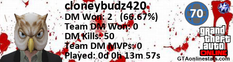 [URL=http://GTAonlinestats.com/showplayer/cloneybudz420][IMG]http://GTAonlinestats.com/dmsignature/cloneybudz420/sig.png[/IMG][/URL]