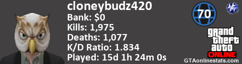 [URL=http://GTAonlinestats.com/showplayer/cloneybudz420][IMG]http://GTAonlinestats.com/signature/cloneybudz420/sig.png[/IMG][/URL]