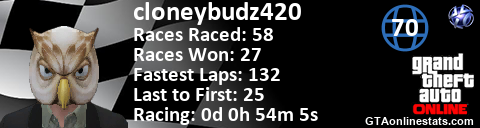<a href="http://GTAonlinestats.com/showplayer/cloneybudz420"><img src="http://GTAonlinestats.com/racesignature/cloneybudz420/sig.png" alt="cloneybudz420" border="0" /></a>