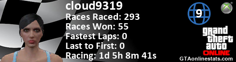 <a href="http://GTAonlinestats.com/showplayer/cloud9319/2"><img src="http://GTAonlinestats.com/racesignature/cloud9319/2/sig.png" alt="cloud9319" border="0" /></a>
