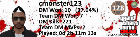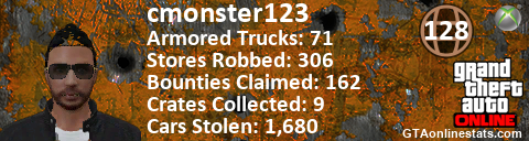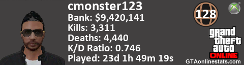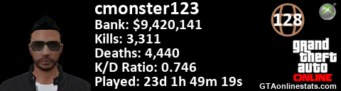 [URL=http://GTAonlinestats.com/showplayer/cmonster123][IMG]http://GTAonlinestats.com/signature/cmonster123/sig.png[/IMG][/URL]