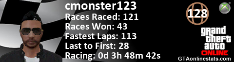 [URL=http://GTAonlinestats.com/showplayer/cmonster123][IMG]http://GTAonlinestats.com/racesignature/cmonster123/sig.png[/IMG][/URL]