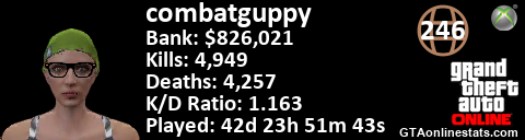 [URL=http://GTAonlinestats.com/showplayer/combatguppy][IMG]http://GTAonlinestats.com/randomsignature/combatguppy/sig.png[/IMG][/URL]