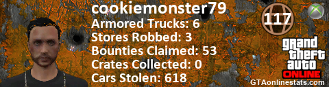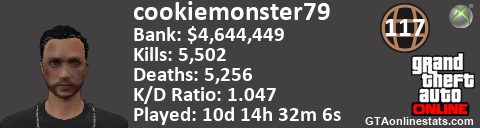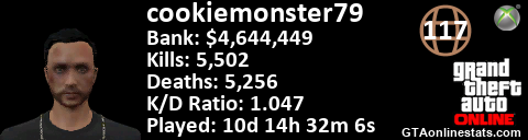 [URL=http://GTAonlinestats.com/showplayer/cookiemonster79][IMG]http://GTAonlinestats.com/signature/cookiemonster79/sig.png[/IMG][/URL]