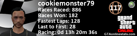 [URL=http://GTAonlinestats.com/showplayer/cookiemonster79][IMG]http://GTAonlinestats.com/racesignature/cookiemonster79/sig.png[/IMG][/URL]