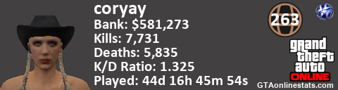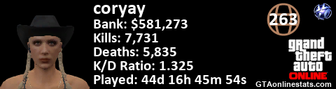 [URL=http://GTAonlinestats.com/showplayer/coryay][IMG]http://GTAonlinestats.com/signature/coryay/sig.png[/IMG][/URL]