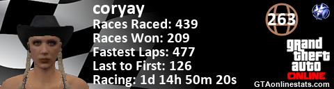 [URL=http://GTAonlinestats.com/showplayer/coryay][IMG]http://GTAonlinestats.com/racesignature/coryay/sig.png[/IMG][/URL]
