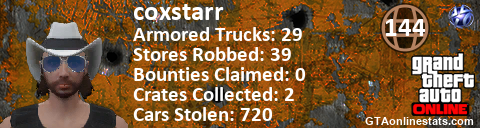 [URL=http://GTAonlinestats.com/showplayer/coxstarr][IMG]http://GTAonlinestats.com/signature/coxstarr/sig.png[/IMG][/URL]