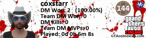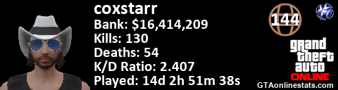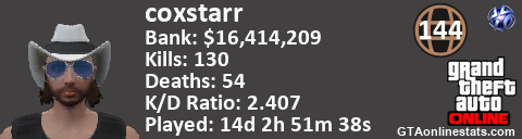 [URL=http://GTAonlinestats.com/showplayer/coxstarr][IMG]http://GTAonlinestats.com/dmsignature/coxstarr/sig.png[/IMG][/URL]