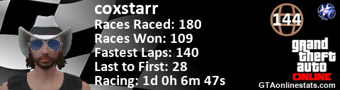 [URL=http://GTAonlinestats.com/showplayer/coxstarr][IMG]http://GTAonlinestats.com/racesignature/coxstarr/sig.png[/IMG][/URL]