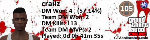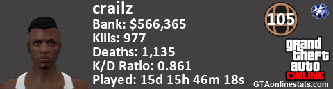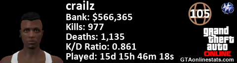 [URL=http://GTAonlinestats.com/showplayer/crailz][IMG]http://GTAonlinestats.com/dmsignature/crailz/sig.png[/IMG][/URL]