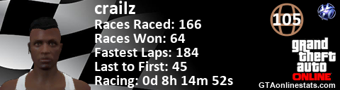[URL=http://GTAonlinestats.com/showplayer/crailz][IMG]http://GTAonlinestats.com/racesignature/crailz/sig.png[/IMG][/URL]