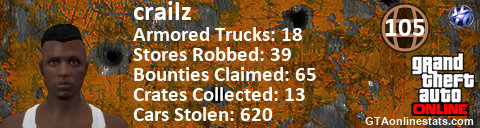 [URL=http://GTAonlinestats.com/showplayer/crailz][IMG]http://GTAonlinestats.com/crimesignature/crailz/sig.png[/IMG][/URL]