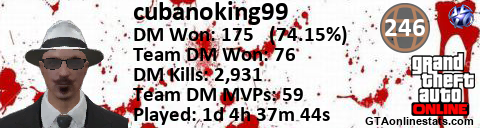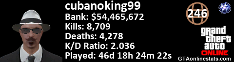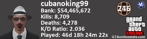 [URL=http://GTAonlinestats.com/showplayer/cubanoking99][IMG]http://GTAonlinestats.com/dmsignature/cubanoking99/sig.png[/IMG][/URL]