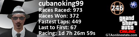 [URL=http://GTAonlinestats.com/showplayer/cubanoking99][IMG]http://GTAonlinestats.com/racesignature/cubanoking99/sig.png[/IMG][/URL]