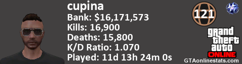 [URL=http://GTAonlinestats.com/showplayer/cupina/2][IMG]http://GTAonlinestats.com/greysignature/cupina/2/sig.png[/IMG][/URL]