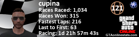 [URL=http://GTAonlinestats.com/showplayer/cupina/2][IMG]http://GTAonlinestats.com/racesignature/cupina/2/sig.png[/IMG][/URL]