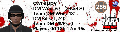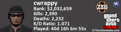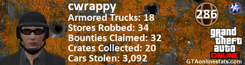 [URL=http://GTAonlinestats.com/showplayer/cwrappy][IMG]http://GTAonlinestats.com/signature/cwrappy/sig.png[/IMG][/URL]