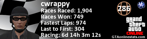 [URL=http://GTAonlinestats.com/showplayer/cwrappy][IMG]http://GTAonlinestats.com/racesignature/cwrappy/sig.png[/IMG][/URL]