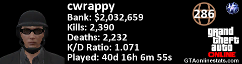 <a href="http://GTAonlinestats.com/showplayer/cwrappy"><img src="http://GTAonlinestats.com/signature/cwrappy/sig.png" alt="cwrappy" border="0" /></a>