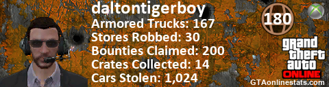 [URL=http://GTAonlinestats.com/showplayer/daltontigerboy][IMG]http://GTAonlinestats.com/randomsignature/daltontigerboy/sig.png[/IMG][/URL]