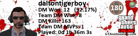 [URL=http://GTAonlinestats.com/showplayer/daltontigerboy][IMG]http://GTAonlinestats.com/dmsignature/daltontigerboy/sig.png[/IMG][/URL]
