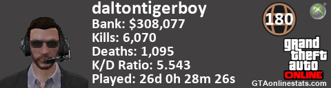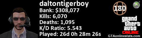 <a href="http://GTAonlinestats.com/showplayer/daltontigerboy"><img src="http://GTAonlinestats.com/dmsignature/daltontigerboy/sig.png" alt="daltontigerboy" border="0" /></a>