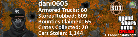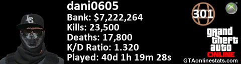 <a href="http://GTAonlinestats.com/showplayer/dani0605"><img src="http://GTAonlinestats.com/randomsignature/dani0605/sig.png" alt="dani0605" border="0" /></a>