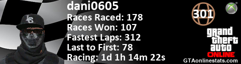 <a href="http://GTAonlinestats.com/showplayer/dani0605"><img src="http://GTAonlinestats.com/racesignature/dani0605/sig.png" alt="dani0605" border="0" /></a>