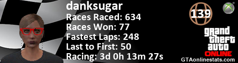 <a href="http://GTAonlinestats.com/showplayer/danksugar"><img src="http://GTAonlinestats.com/racesignature/danksugar/sig.png" alt="danksugar" border="0" /></a>
