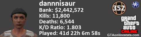[URL=http://GTAonlinestats.com/showplayer/dannnisaur][IMG]http://GTAonlinestats.com/randomsignature/dannnisaur/sig.png[/IMG][/URL]