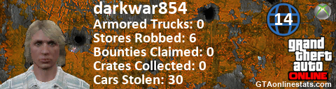 [URL=http://GTAonlinestats.com/showplayer/darkwar854/2][IMG]http://GTAonlinestats.com/crimesignature/darkwar854/2/sig.png[/IMG][/URL]