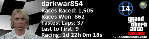 [URL=http://GTAonlinestats.com/showplayer/darkwar854/2][IMG]http://GTAonlinestats.com/racesignature/darkwar854/2/sig.png[/IMG][/URL]