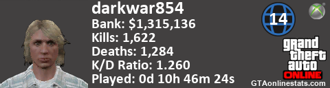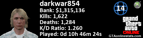 [URL=http://GTAonlinestats.com/showplayer/darkwar854/2][IMG]http://GTAonlinestats.com/greysignature/darkwar854/2/sig.png[/IMG][/URL]