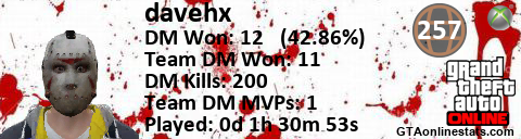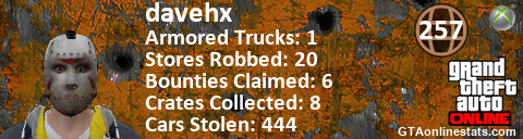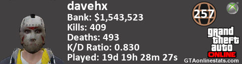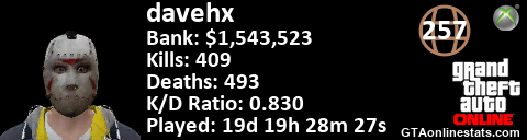 [URL=http://GTAonlinestats.com/showplayer/davehx][IMG]http://GTAonlinestats.com/signature/davehx/sig.png[/IMG][/URL]