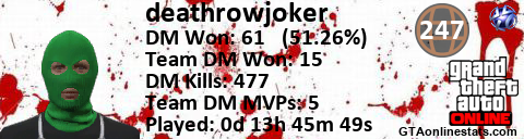 [URL=http://GTAonlinestats.com/showplayer/deathrowjoker][IMG]http://GTAonlinestats.com/dmsignature/deathrowjoker/sig.png[/IMG][/URL]