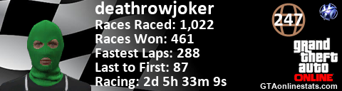 [URL=http://GTAonlinestats.com/showplayer/deathrowjoker][IMG]http://GTAonlinestats.com/racesignature/deathrowjoker/sig.png[/IMG][/URL]