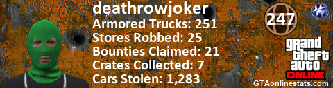 [URL=http://GTAonlinestats.com/showplayer/deathrowjoker][IMG]http://GTAonlinestats.com/crimesignature/deathrowjoker/sig.png[/IMG][/URL]