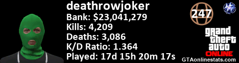 [URL=http://GTAonlinestats.com/showplayer/deathrowjoker][IMG]http://GTAonlinestats.com/randomsignature/deathrowjoker/sig.png[/IMG][/URL]