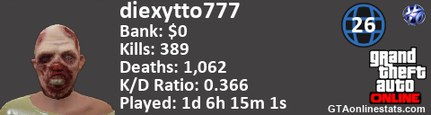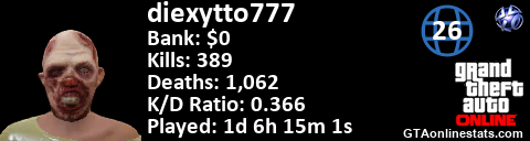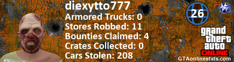 <a href="http://GTAonlinestats.com/showplayer/diexytto777"><img src="http://GTAonlinestats.com/randomsignature/diexytto777/sig.png" alt="diexytto777" border="0" /></a>