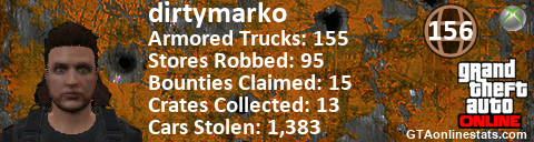 <a href="http://GTAonlinestats.com/showplayer/dirtymarko"><img src="http://GTAonlinestats.com/greysignature/dirtymarko/sig.png" alt="dirtymarko" border="0" /></a>