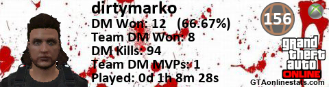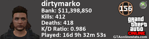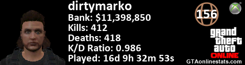 <a href="http://GTAonlinestats.com/showplayer/dirtymarko"><img src="http://GTAonlinestats.com/dmsignature/dirtymarko/sig.png" alt="dirtymarko" border="0" /></a>