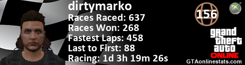 <a href="http://GTAonlinestats.com/showplayer/dirtymarko"><img src="http://GTAonlinestats.com/racesignature/dirtymarko/sig.png" alt="dirtymarko" border="0" /></a>