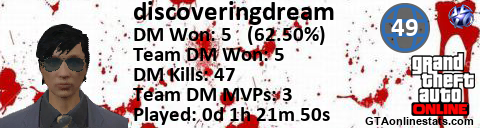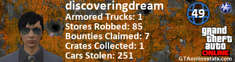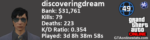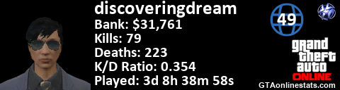 <a href="http://GTAonlinestats.com/showplayer/discoveringdream"><img src="http://GTAonlinestats.com/dmsignature/discoveringdream/sig.png" alt="DiscoveringDream" border="0" /></a>