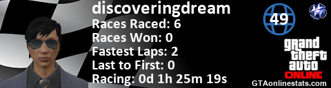 [URL=http://GTAonlinestats.com/showplayer/discoveringdream][IMG]http://GTAonlinestats.com/racesignature/discoveringdream/sig.png[/IMG][/URL]